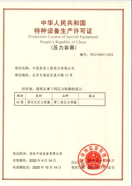中华人民共和国特种设备生产许可证(压力容器)